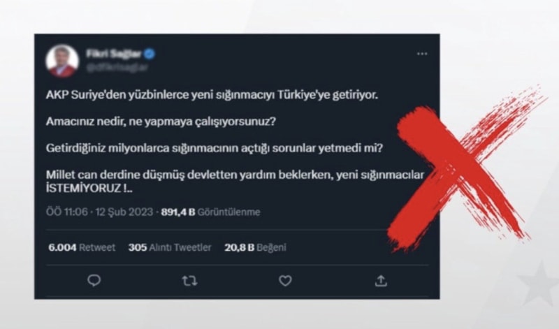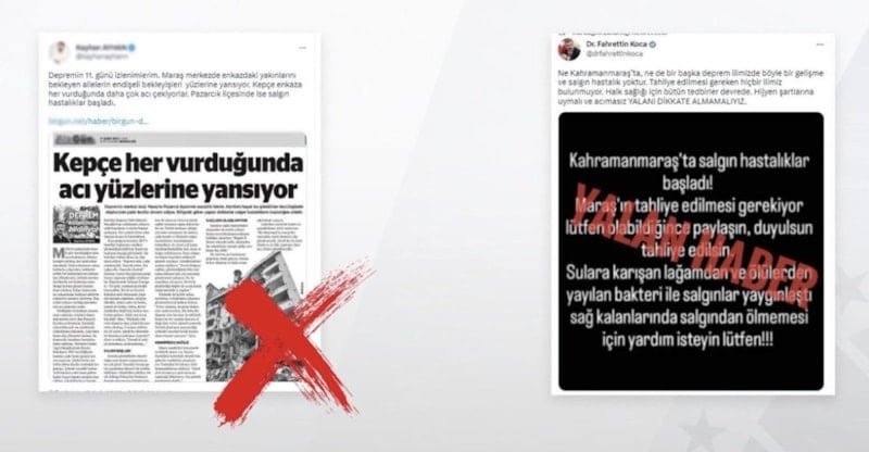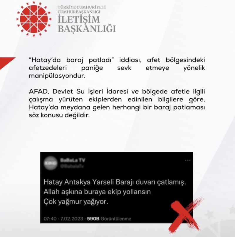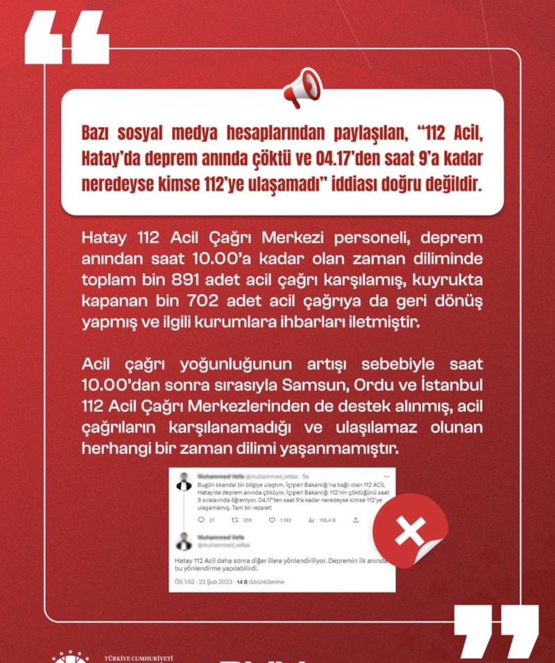 6 Şubat gecesi Türkiye acı ve gözyaşı ile canlarını kurtarmaya çabalarken bazı çıkar çevreleri servis ettikleri onlarca yalanla süreci olumsuz etkiledi. Dezenformasyonla Mücadele Merkezi onlarca yalanı ortaya çıkartarak mücadelenin moralini yüksek tutmaya çalıştı