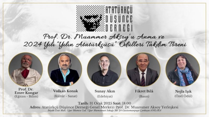 Atatürkçü Düşünce Derneği’nin 2024 Yılı “Yılın Atatürkçüsü” ödüllerini kazananlar belli oldu. Bu yılın eğitim-bilim alanındaki yılın Atatürkçüsü ödülüne Emre Kongar seçildi. Kültür ve sanat alanında şarkıcı Volkan Konak, edebiyatta ise yılın Atatürkçüsü Sunay Akın olarak belirlendi.