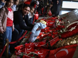Ankaralılar, bu yıl da Anıtkabir'i ziyaret etti. Dün on binlerce kişinin akın ettiği Anıtkabir'de çekilen bir fotoğraf bugün gazete sayfalarına yansıdı. Fotoğrafta yer alan bir aile bebeklerini Atatürk'ün mozolesine yatırıp fotoğrafını çekti.