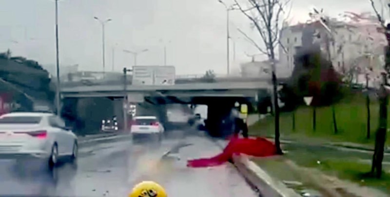 Sürücünün yağmura rağmen bayrağı kaldırmaya çalıştığı anlar, trafikteki başka bir sürücü tarafından cep telefonu kamerasıyla kaydedildi.