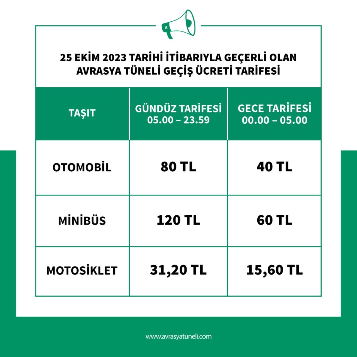 Yapılan açıklamaya göre Avrasya Tüneli'nde gece yarısı ve sabah 05.00 arasında geçerli olan yüzde 50 indirimli tarife uygulamasına devam edildi.