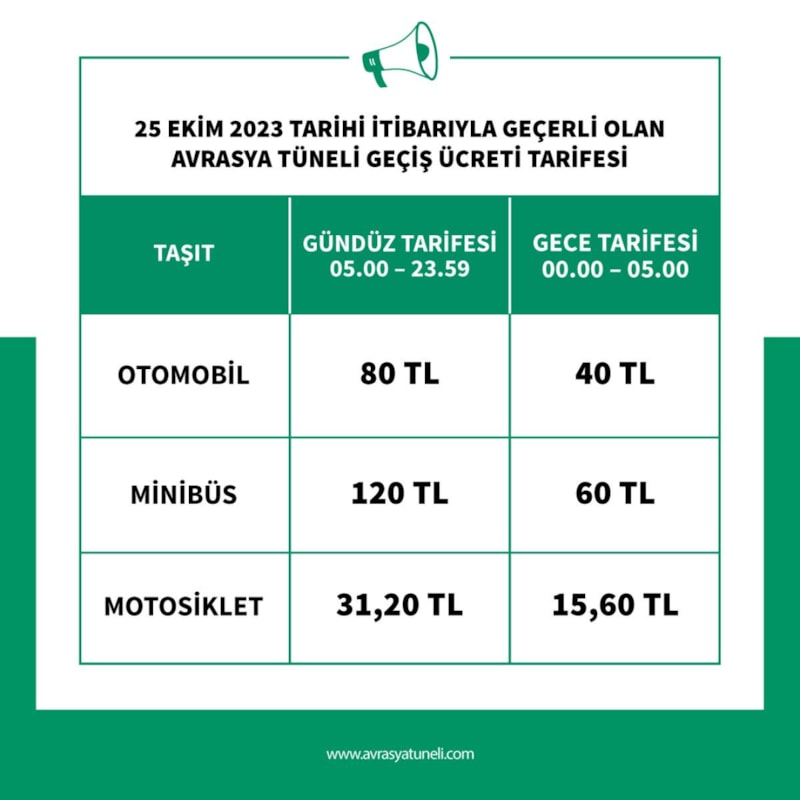 Bugün itibarıyla geçerli olmak üzere Avrasya Tüneli geçiş ücretlerine yüzde 51 zam yapıldı. Otomobiller için tek geçiş ücreti 53 liradan 80 liraya yükseltildi.