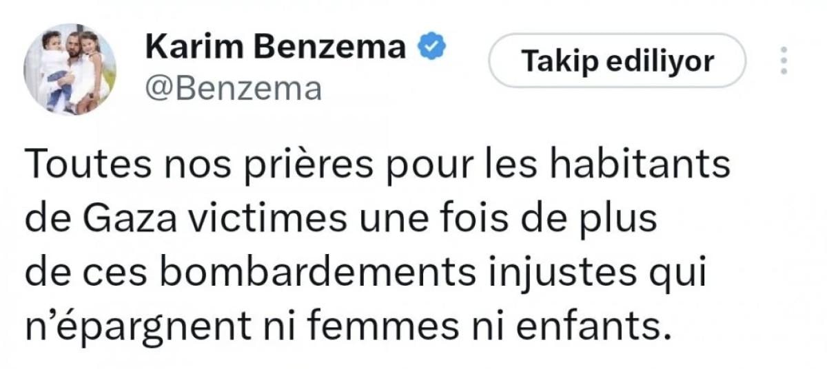Benzema, "Tüm dualarımız bir kez daha kadınlar ve çocukları ayırt etmeyen haksız bombalamaların kurbanı olan tüm Gazze sakinleri için" paylaşımında bulundu.