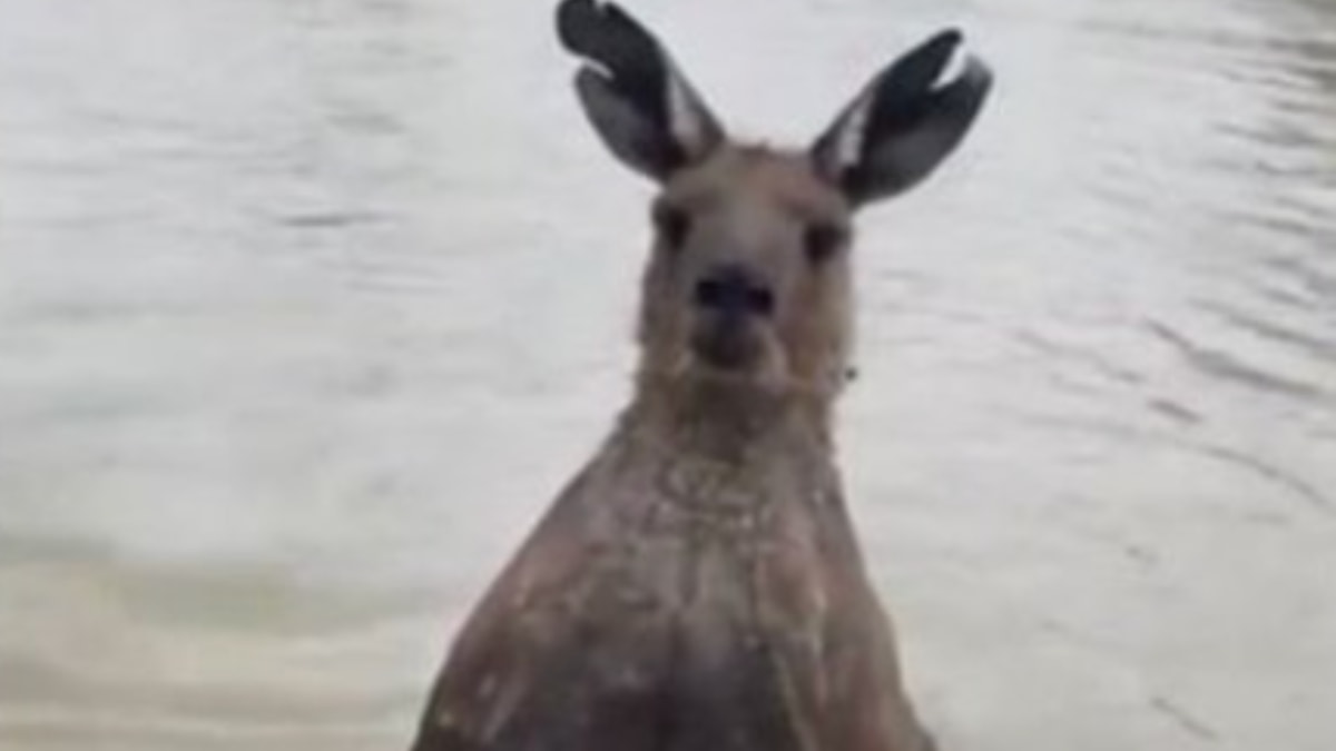 Nehirde bulunan 2 metre boyundaki kanguru, bir köpek ve sahibine zor anlar yaşattı.