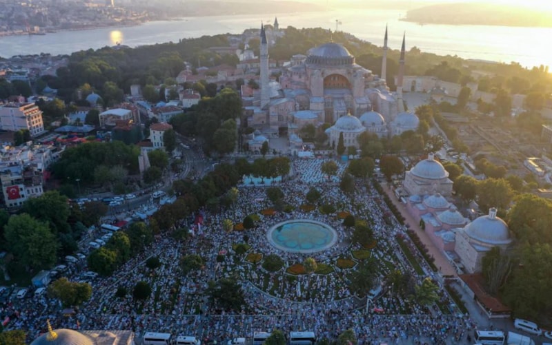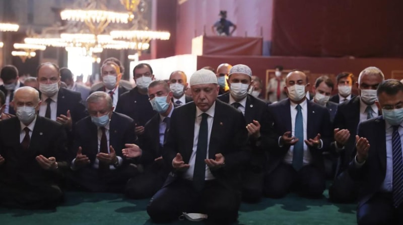 Ayasofya-i Kebir Cami-i Şerifi'nin 4 minaresinden 4 müezzinle ezan okundu, 86 yıl sonra kılınan ilk namazda; Cumhurbaşkanı Erdoğan, TBMM Başkanı Mustafa Şentop, Cumhurbaşkanı Yardımcısı Fuat Oktay ve MHP Genel Başkanı Devlet Bahçeli'nin yanı sıra çok sayıda Müslüman saf tuttu.