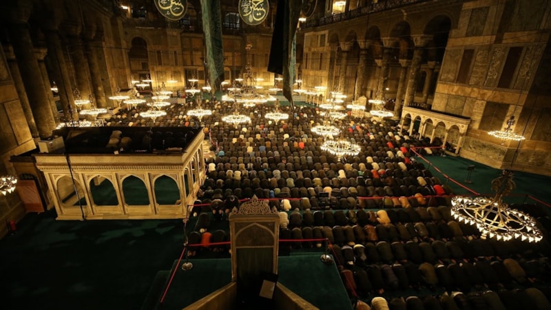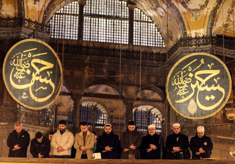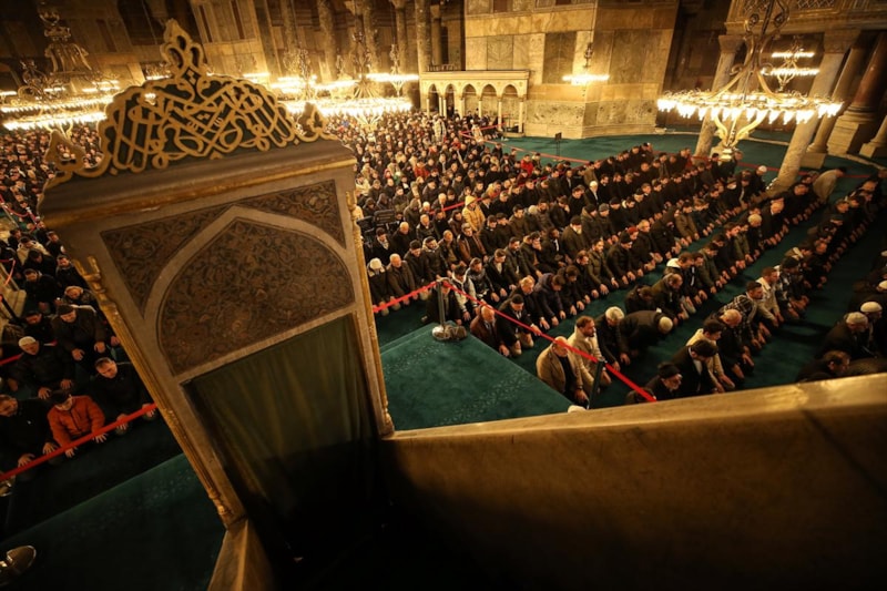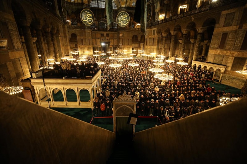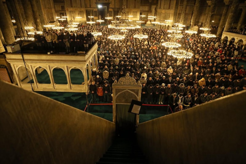 Ayasofya Camii'nin ibadete açılmasının 3'üncü senesinde Miraç Kandili'ni idrak etmek için gelen vatandaşlar, ibadet edip dualar etti.