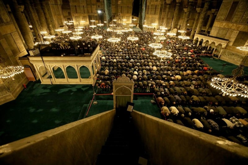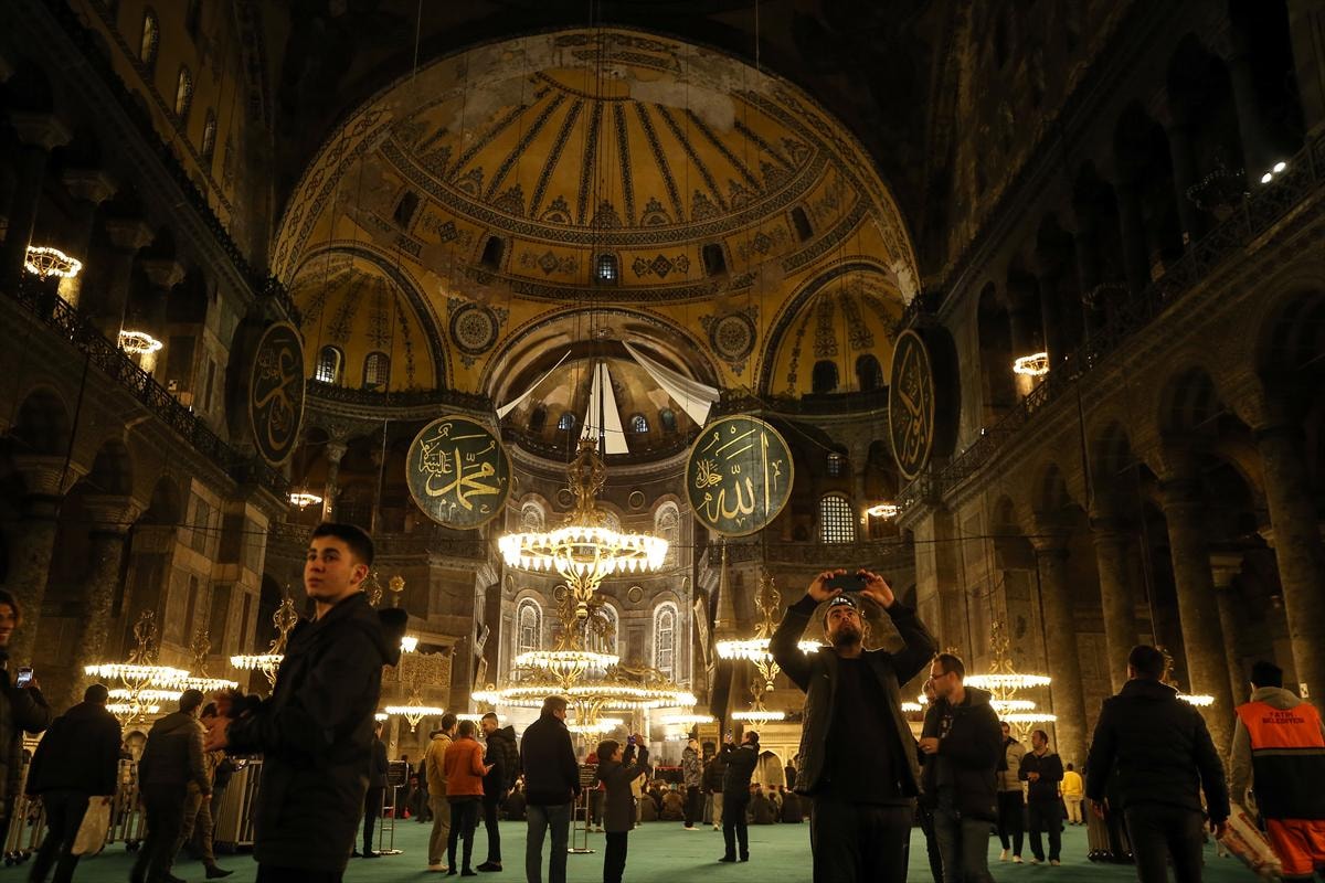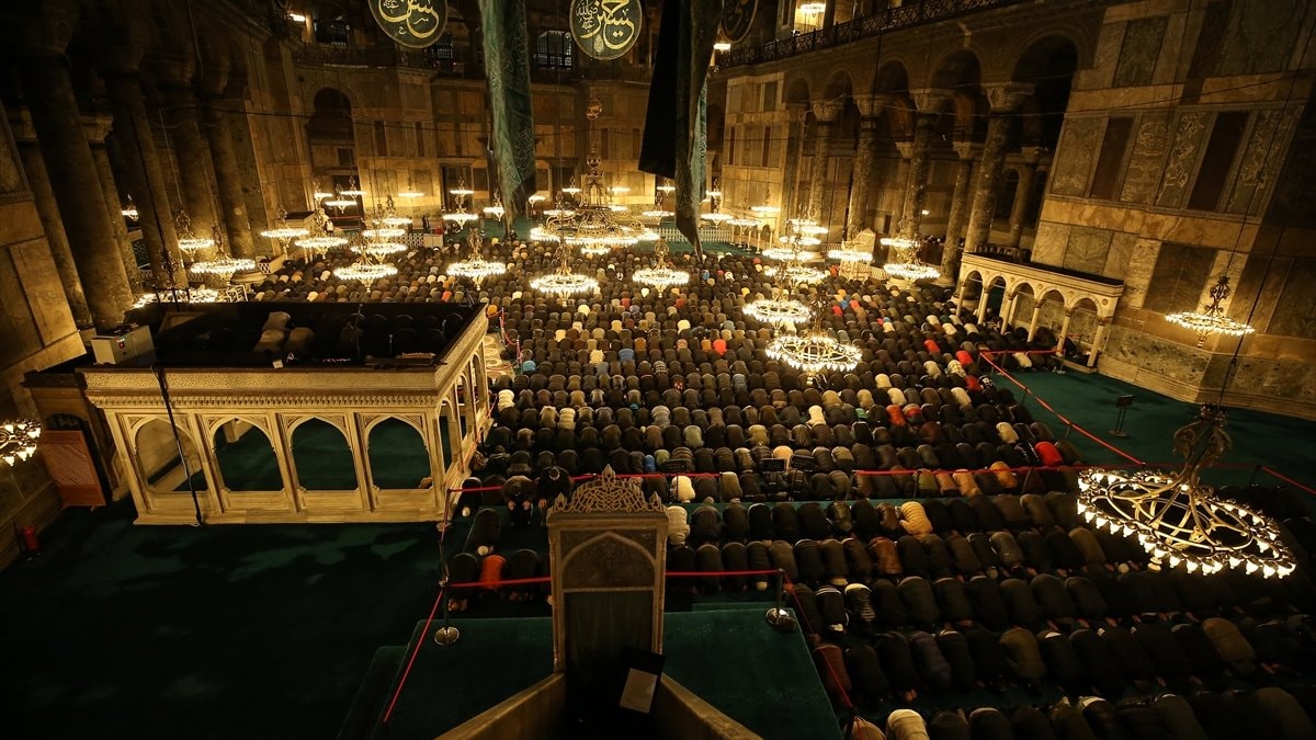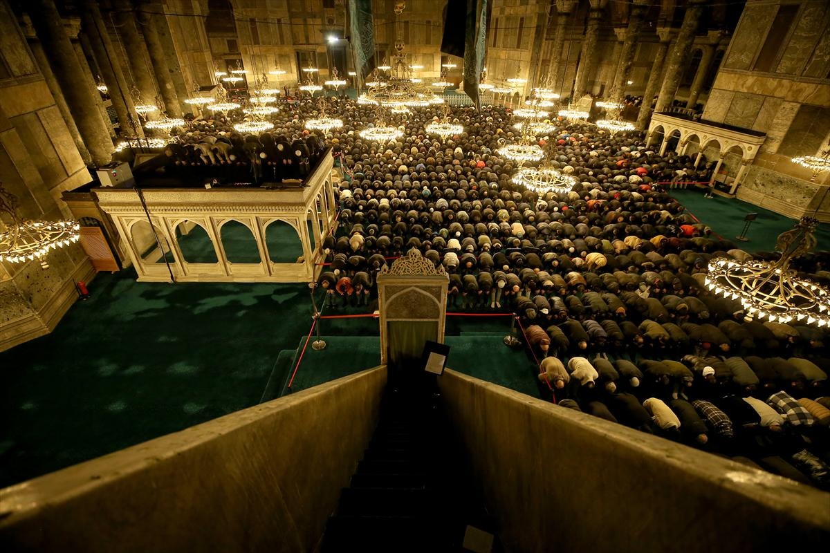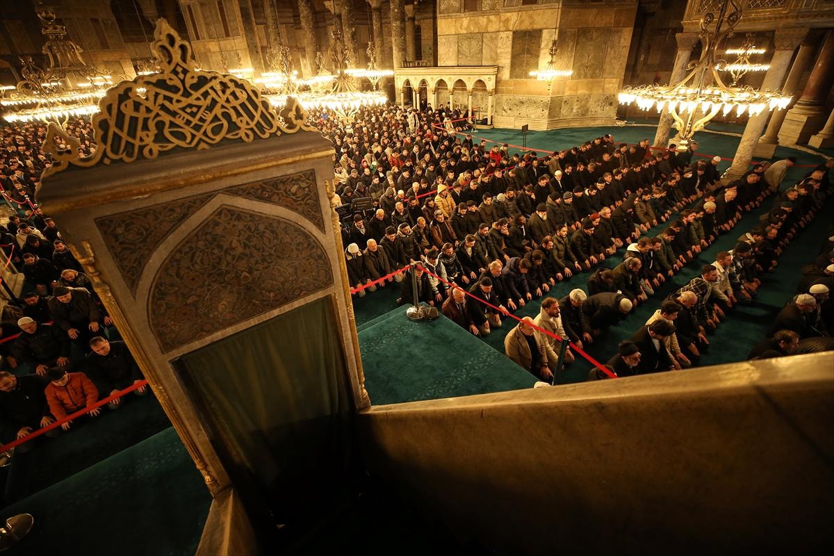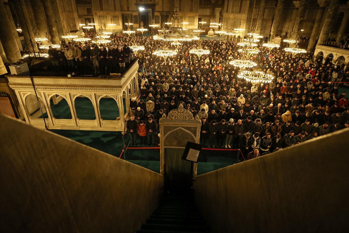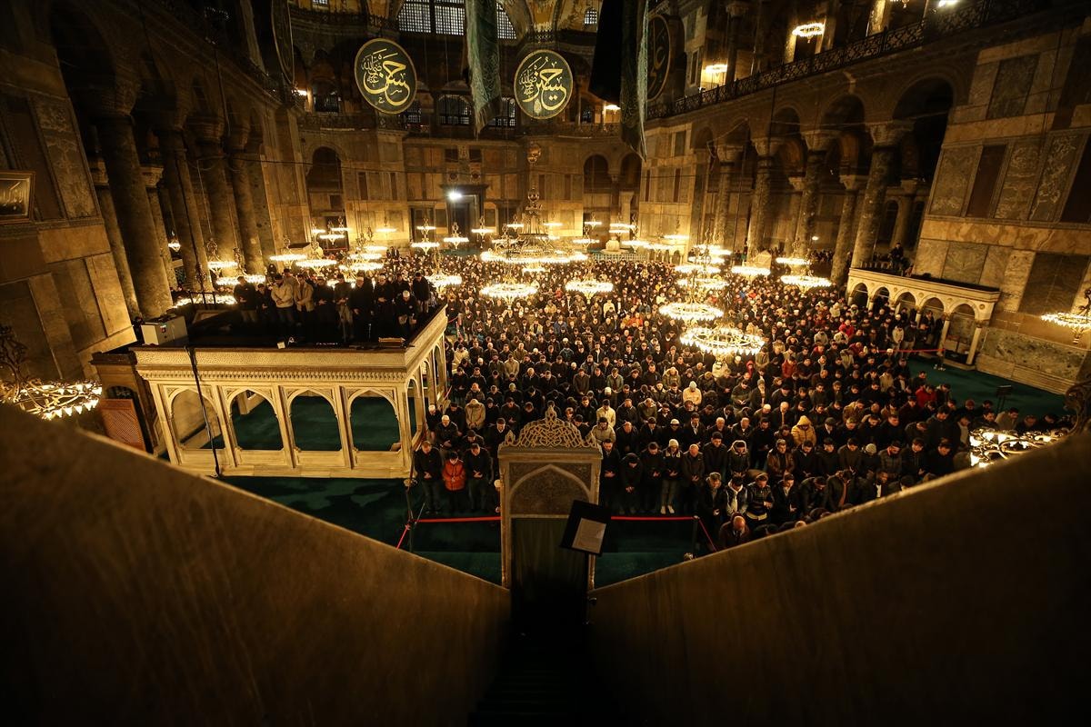 Bu yıl açılışının 3’üncü yılında akşam ezanıyla birlikte Ayasofya'ya gelen vatandaşlar yatsı namazına kadar Kur'an-ı Kerim okuyup, dualar etti.