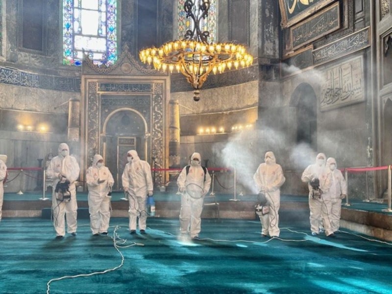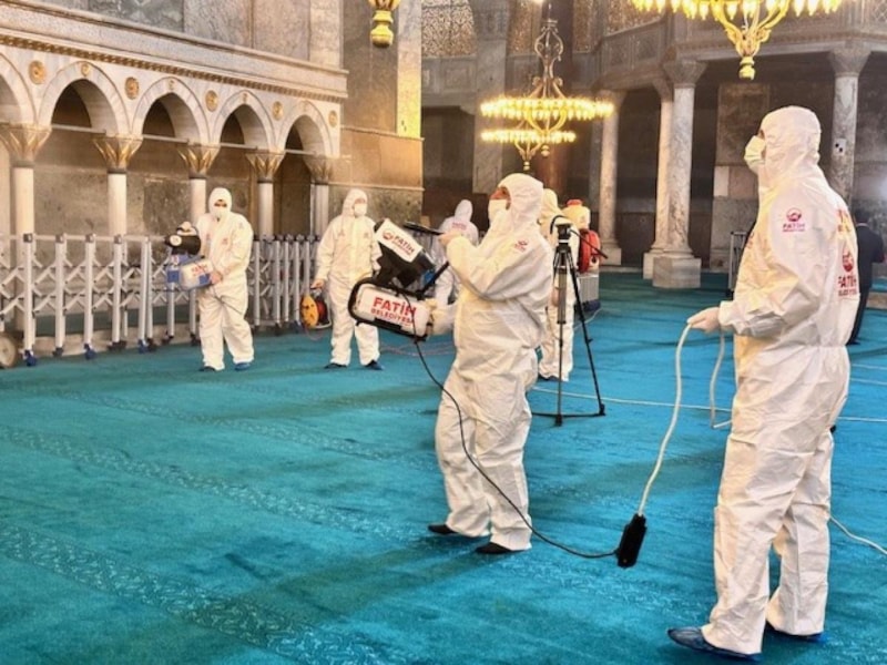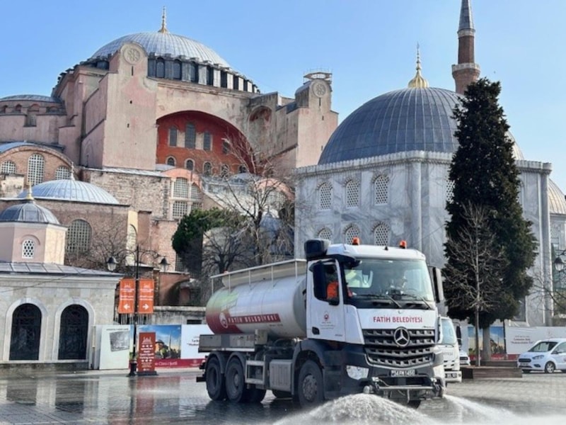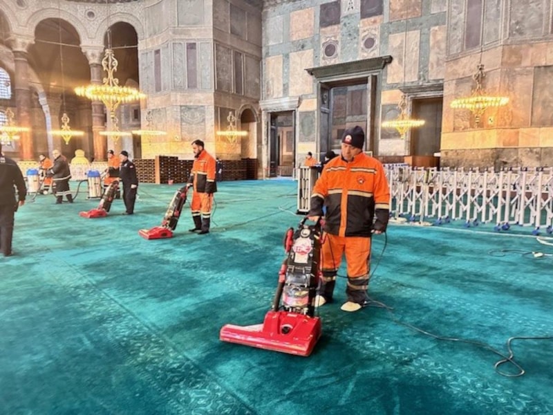 Ramazan ayı öncesi Ayasofya Camii'nde temizlik yaptıklarını söyleyen Fatih Belediyesi Çevre Koruma ve Kontrol Müdür Yardımcısı Recep Yıldız, “Ayasofya Cami içerisinde yaklaşan Ramazan ayı öncesinde Fatih Belediyesi olarak 20 kişiden oluşan ekibimizle birlikte temizlik çalışmaları yapmaktayız. Yapılan çalışmalar kapsamında cami içerisinde halılar, ayakkabılıklar temizlenmekte ve dezenfekte çalışmaları yapılmaktadır. Cami dışında ise avlunun, meydanın ve şadırvanların yıkanması sıcak su kullanılarak yapılmaktadır. Çalışmalarımız Ramazan ayı boyunca 7/24 çalışma esasına göre devam edecek olup her akşam gül suyu sıkılacaktır. Amacımız Ayasofya Camii’ni ziyarete gelenlere daha temiz daha hijyenik bir ortamda ibadet etmelerini sağlanmaktır.” ifadelerini kullandı.