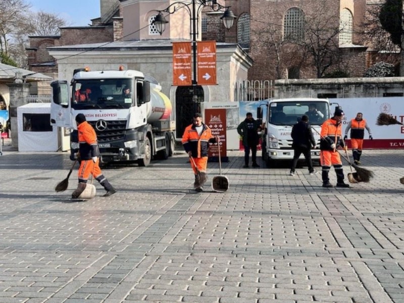 Fatih Belediyesi’ne bağlı Çevre Koruma ve Kontrol Müdürlüğü ekipleri, Ramazan ayı öncesinde Fatih Belediyesi, Ayasofya Camii ve çevresinde temizlik yaptı.