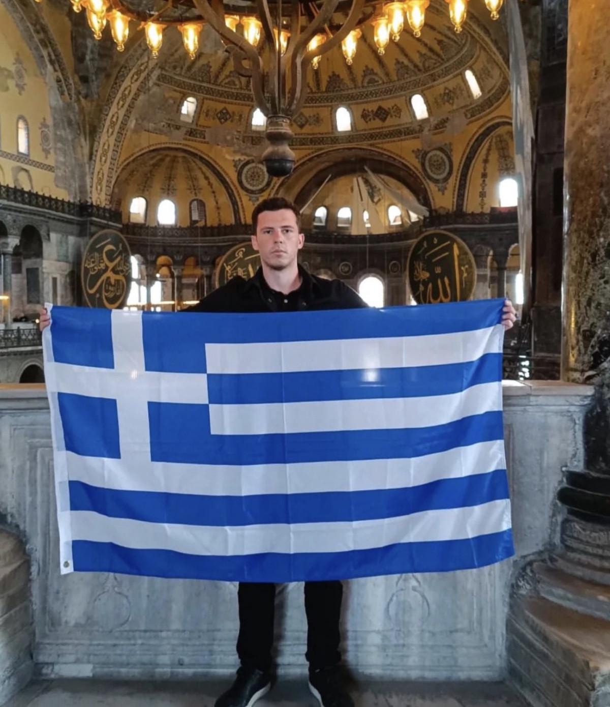 Şahıs, Yunanistan bayrağı açarak fotoğraf çektirdi.