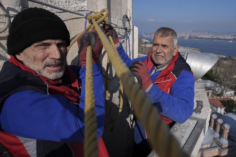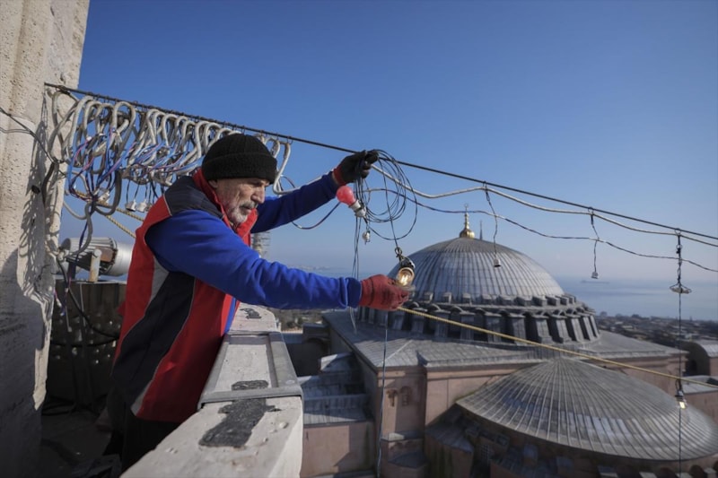 Usta ve ekibi, mahyayı asmak için önce minaraye çıktı. Daha sonra mahya, saatler süren çalışmayla Ayasofya-i Kebir Camii Şerifi'nin iki minaresi arasına yerleştirildi.