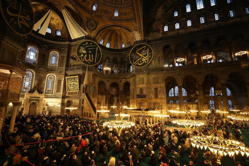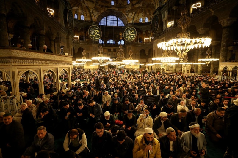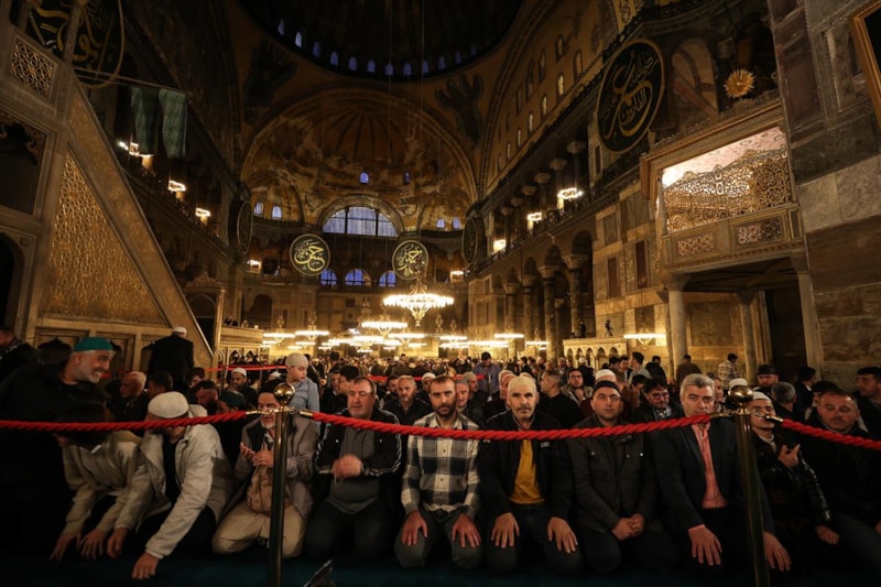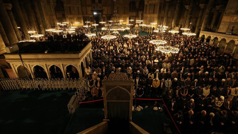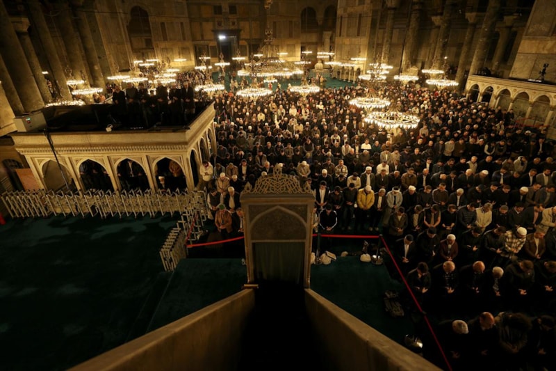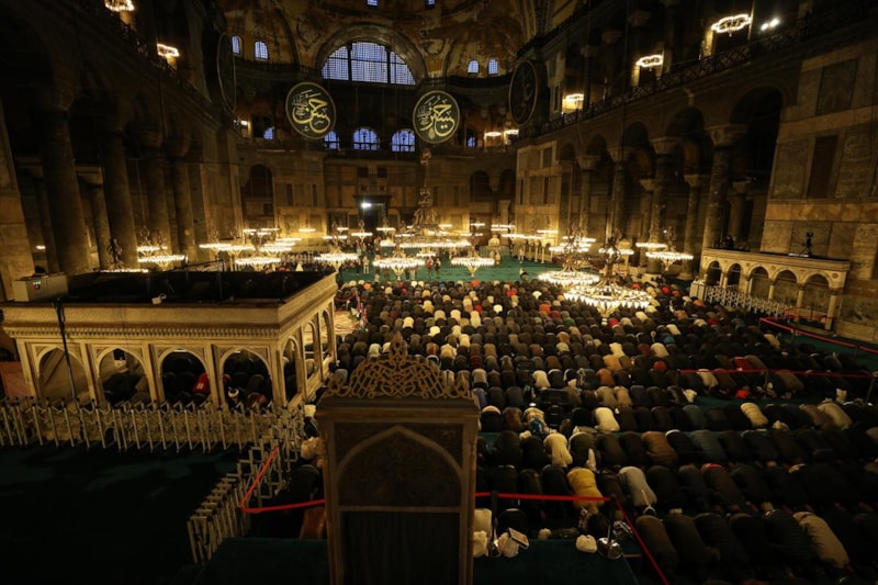 86 yıl sonra yeniden ibadete açılan Ayasofya Camisi'nde teravih namazı için hazır bulunan vatandaşlar, Kur'an-ı Kerim tilaveti, ilahiler ve dualar eşliğinde ellerini semaya açtı, sağlık, sıhhat, afiyet, helalinden bol kazanç, bağışlanma ve hayırlar, birlik, dirlik ve barış temennisinde bulundu.
