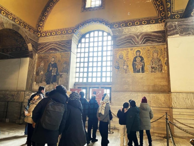 Oradan çıkıyorlar. Bir kolaylık sağlamışlar, tekerlekli sandalyeliler için giriş sağlamışlar. Bu da güzellik olmuş. Minare inşaatı var, koruma amaçlı şimdilik bunu koymuşlar. Şu anda görüntü kötü ama kaldıracaklar. Misafirlere herhangi bir zarar gelmesin diye yapıldı. Şimdilik koymuşlar onu, kaldıracaklar. İçeri giriyor misafirler. Misafirler girdikten sonra ikinci kata çıkıyor. Daha evvelden çıkış kapısı, şu an giriş kapısı olmuş. Ve misafirlerin en çok görmek istediğim özelliklerden bir tanesi olan Meryem Ana, Hazreti İsa, İmparator Konstantin ve Justinianus bölümleri gördükten sonra ziyareti sona erdiriyorlar." ifadelerini kullandı.
