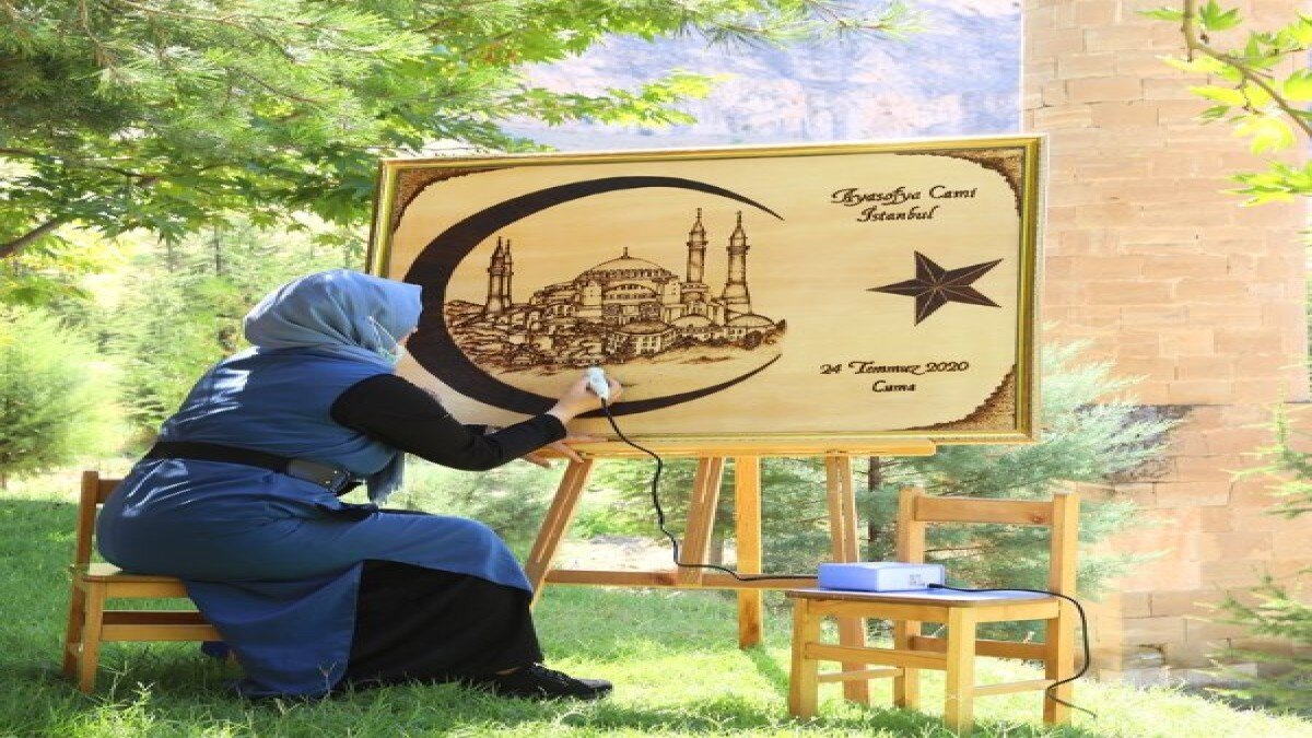 Bir hafta süren ve bugün sabah tamamlanan ahşap yakma tekniğiyle ay yıldız içine Ayasofya Camii'nin resminin işlendiği tablo, bugün gerçekleştirilen cami açılışı anısına görevli olduğu okulda sergilenmeye başladı.