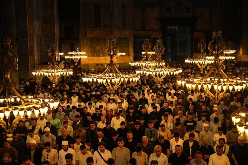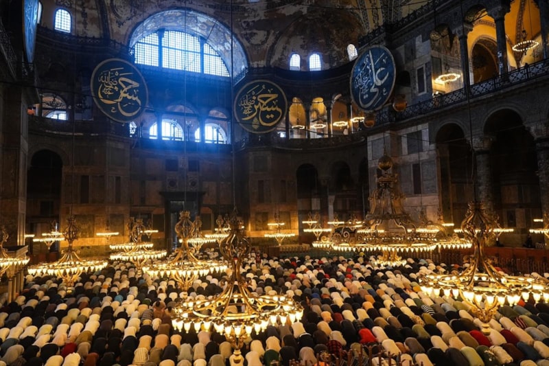İstanbul’da Kurban Bayramı namazı için Ayasofya-i Kebir Cami-i Şerifi önünde binlerce kişi sabahın erken saatlerinde bir araya gelirken içeride yer bulamayan vatandaşlar, seccadelerini bahçeye sererek namazlarını bahçede kıldı.