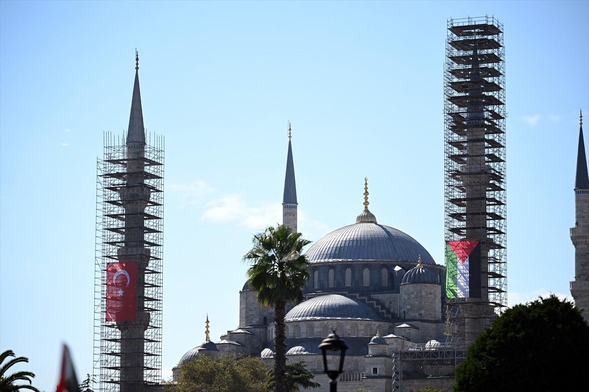 Sultanahmet Camii'nin minarelerine asılan Türk bayrağı ve Filistin bayrağı görüntülendi.