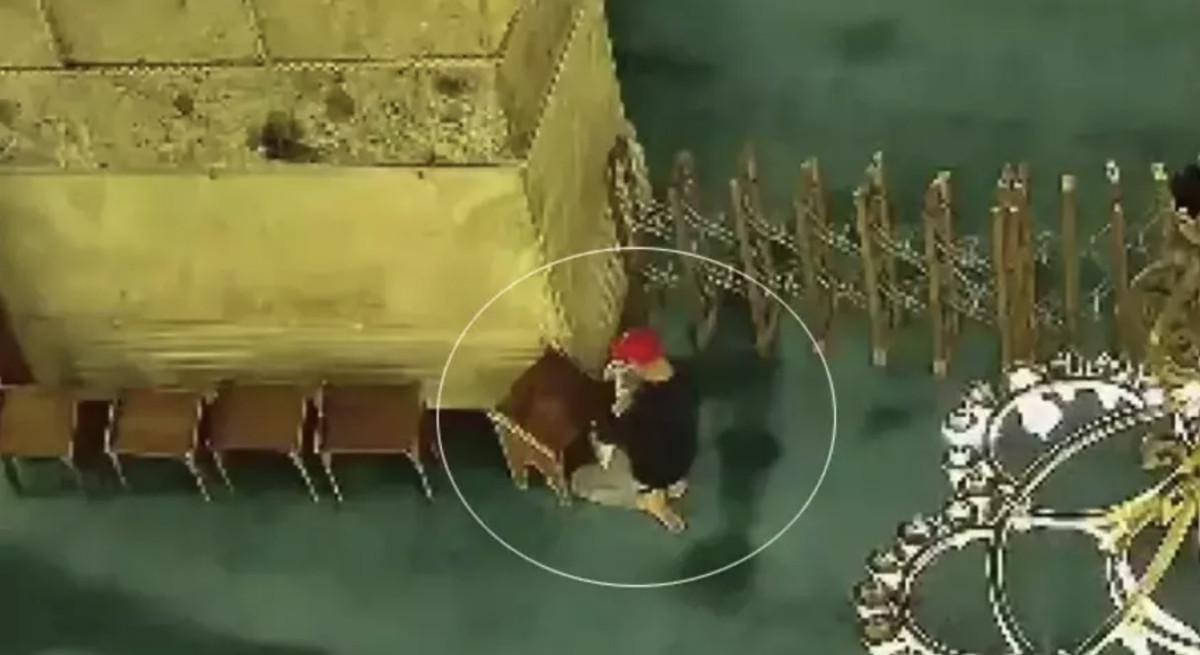 Kırmızı şapkalı bir kişi, rahlenin arkasına gizlenerek kağıtları ateşe verdi.