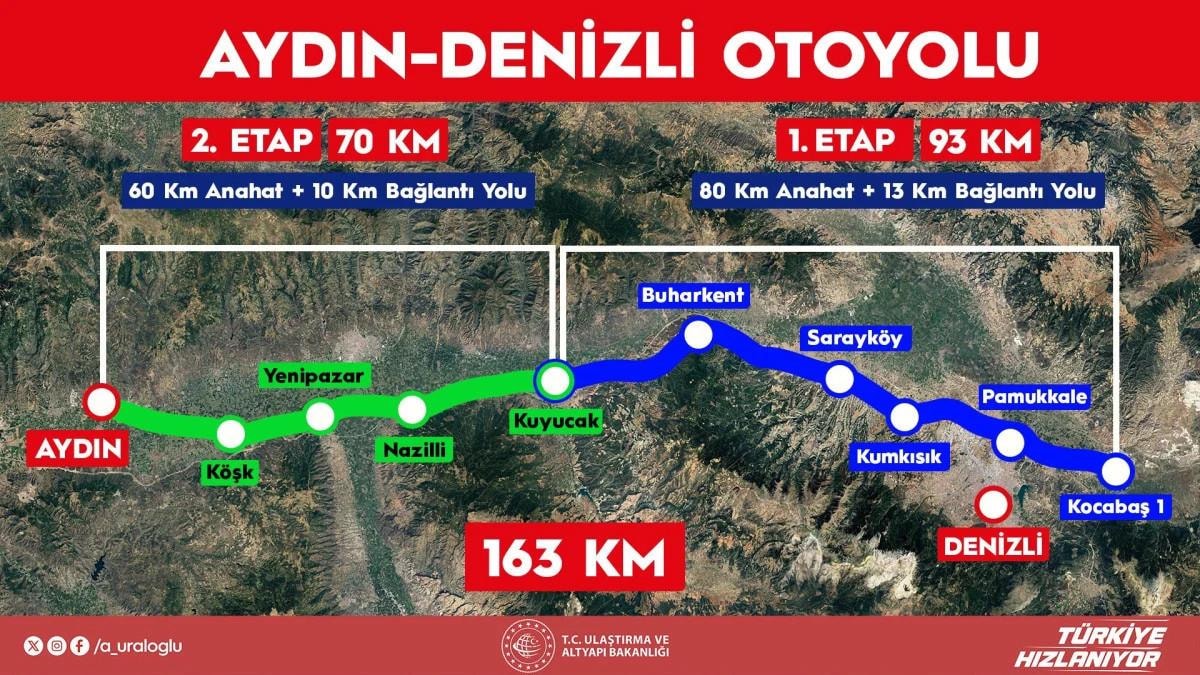 Bakan Uraloğlu, otoyol güzergahının trafiğe açılan ilk etabının Kocabaş'tan başlayıp Pamukkale, Kumkısık, Sarayköy ve Buharkent ilçelerini geçerek Kuyucak'a ulaştığını belirtti.