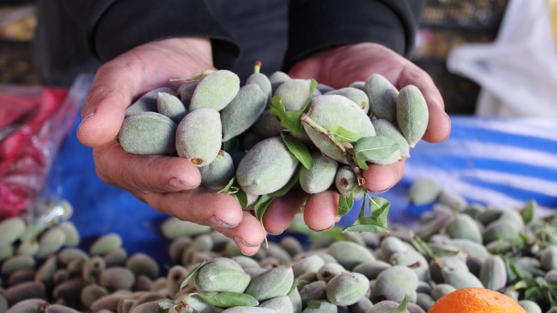 Birçok insanın severek tükettiği meyvelerden olan çağla bademi ise Aydın'da pazar tezgahlarında yerini aldı.