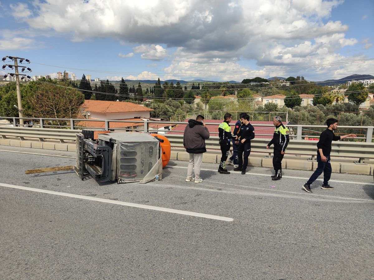 Devrilen aracın altında kalan genç işçi, çevredekilerin yardımıyla kurtarıldı.