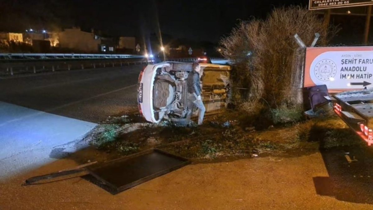 Aydın'ın Söke ilçesinde meydan gelen trafik kazasında otomobil yan yatarken, sürücü kazayı yara almadan atlattı.