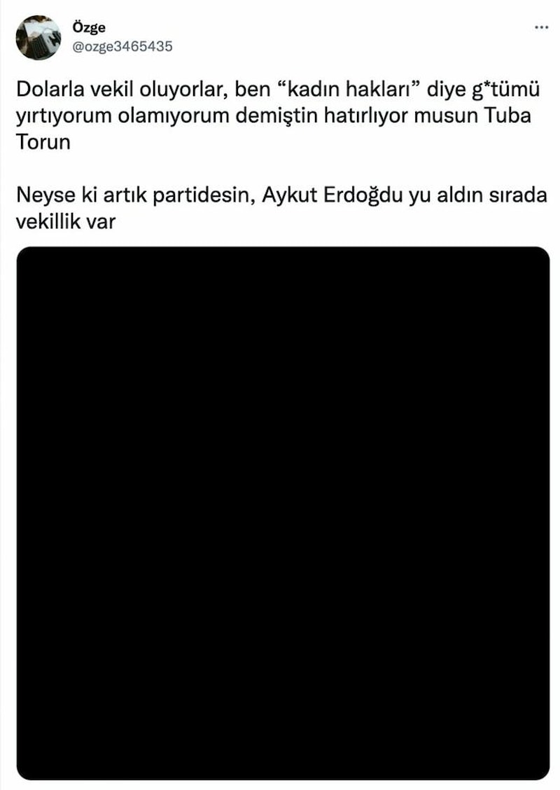 Tuba Torun'a ve Özge Pomen'e ait olduğu iddia edilen ses kayıtlarında; Tuba Torun'un "Dolarla milletvekili oluyorlar, ben burada sabahtan akşama kadar kadın hakları diye g***mü yırtıyorum. Şerefsizin birine inandım tamam mı ve inandığım için de evet kendimi ortaya koydum. Ve şu anda da istifa edeceğim, tamam a**na k****ım ya." dediği duyuldu.