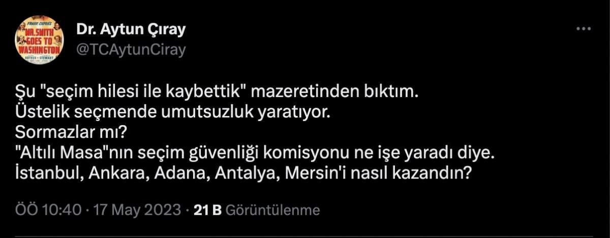 "Şu "seçim hilesi ile kaybettik" mazeretinden bıktım. Üstelik seçmende umutsuzluk yaratıyor. Sormazlar mı Altılı Masa'nın seçim güvenliği komisyonu ne işe yaradı diye. İstanbul, Ankara, Adana, Antalya, Mersin'i nasıl kazandın?"