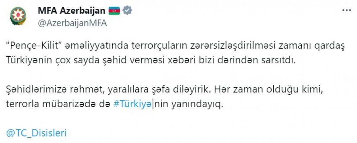 Dayanışma mesajları veren Azerbaycan Dışişleri Bakanlığı, Pençe-Kilit Harekatı bölgesinden gelen şehit haberleri nedeniyle derinden üzüntü duyduklarını belirtti.