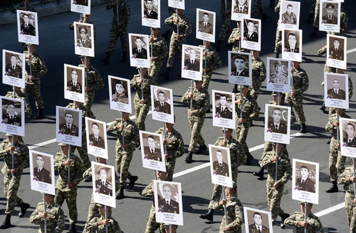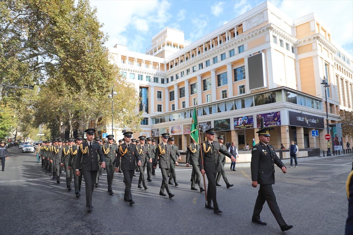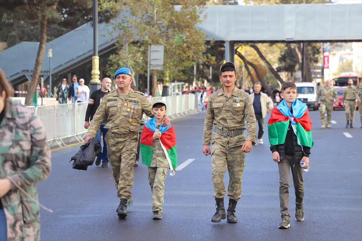 "Zafer Günü" kutlamaları kapsamında Bakü'nün çeşitli bölgelerinde düzenlenen yürüyüşlere, askerler ve Karabağ Savaşı gazileri katıldı.