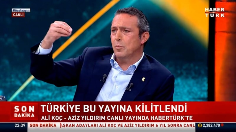Aziz Yıldırım ile Ali Koç, Habertürk TV canlı yayınında karşı karşıya geldi. Aziz Yıldırım, Ali Koç'a karşı, "Aliciğim 6 senedir iyi olan bir şey yok ki? Benim de son 4 senem kötü." ifadelerini kullandı.