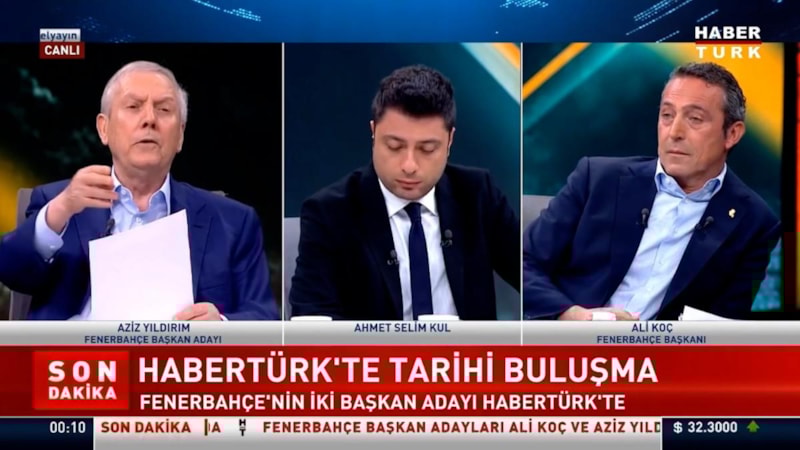 Fenerbahçe'de yapılacak başkanlık seçimleri öncesinde mevcut başkan Ali Koç ve başkan adayı Aziz Yıldırım, Habertürk TV'de karşı karşıya geldi.