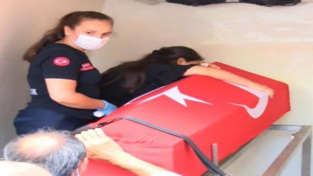 Polis konvoyu ile evinin önüne getirilen tabuta şehidin annesi, babası ve eşi sarılarak ağladı.