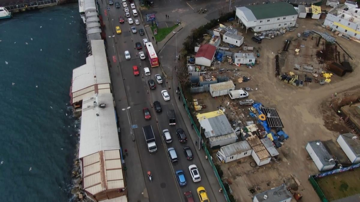 Yapılan çalışma nedeniyle uzun araç kuyrukları oluştu. Bölgede yaşan trafik yoğunluğu havadan görüntülendi.