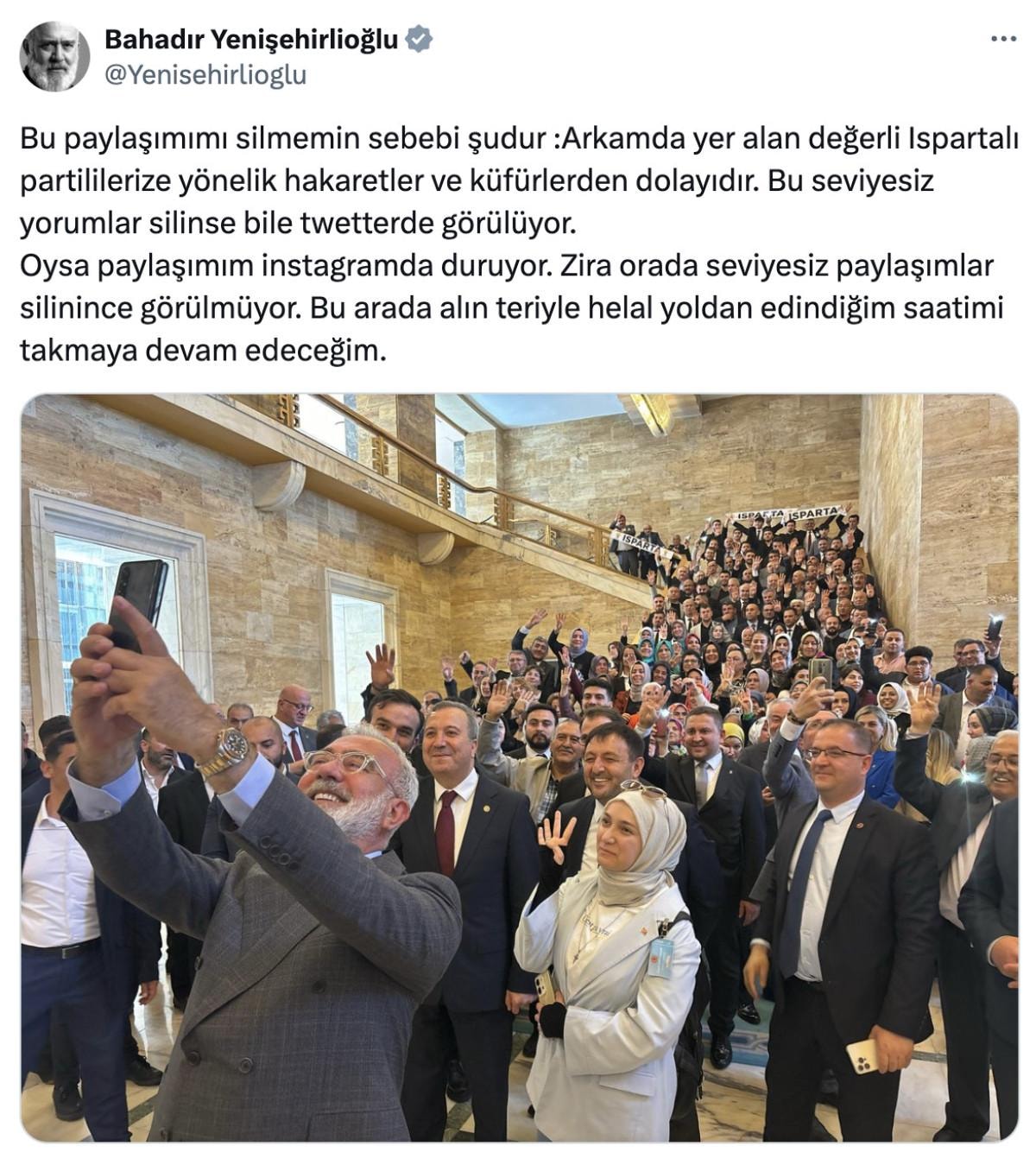 Bu paylaşımımı silmemin sebebi şudur: Arkamda yer alan değerli Ispartalı partililerimize yönelik hakaretler ve küfürlerden dolayıdır.