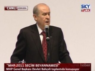 MHP'nin yükselen ülke Türkiye vizyonu için ortaya koyduğumuz vaatler ana hatlarıyla bunlardır. MHP seçimlere tek başına girecek ve hiç bir siyasi parti ile seçim ittifakı yapması sözkonusu olmayacaktır. MHP'nin güveneciği yegane yer büyük Türk milletinin temiz yüreği, eşsiz sağduyusudur. MHP'nin iktidar yürüyüşü, Okyanus Öteleri'ndeki fetvacılardan, imralı canilerinden, Brüksel'den değil büyük Türk milletidir. MHP bu güçle seçimlere tek başına girecek, milli şuur şahlanışıyla cenabı allahın izniyle muzaffer olacaktır. MHP'nin tek hedefi tek başına iktidardır. Diğer partilerle koalisyon amacı yoktur. Bizim ittifakımız sadece milletledir. Türk milleti bu sese kulak verecektir. Sesime kulak ver Türkiye, sesime ses ver Türkiye... Türkiye ayağa kalkarak bu çağrımızı karşılıksız bırakmayacak. Türkiye tek yürek ve tek nefes olacaktır. Çekilen çilelerin, kul ve yetim hakkına el uzatmanın ahı, etnik bölücülüğün vebali Başbakan Erdoğan'ın yakasına yapışacaktır. Allah yar ve yardımcımız olsun.