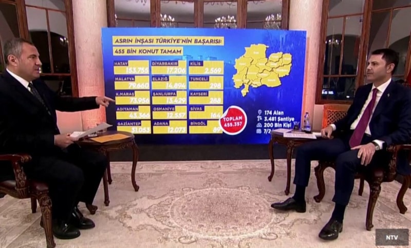 Deprem bölgesindeki çalışmalara ilişkin bilgi veren Kurum, cumartesi günü 455 bininci konutun anahtar tesliminin yapılacağını söyledi. Hatay başta olmak üzere 11 ilde yoğun bir inşa süreci yürütüldüğünü belirten Kurum, “Asrın inşasını gerçekleştirdik, bu ölçekte bir çalışma dünyada da nadirdir” dedi.