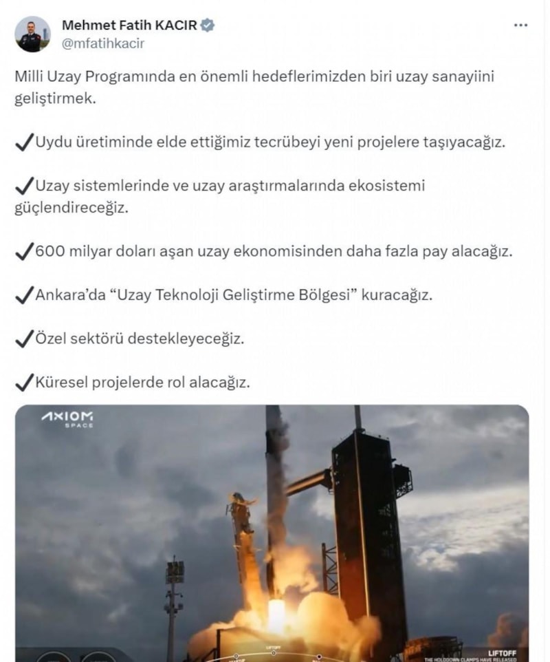 600 milyar doları aşan uzay ekonomisinden pay alınacağını söyleyen Kacır, madde madde yaptığı paylaşımda, şu ifadelere yer verdi: