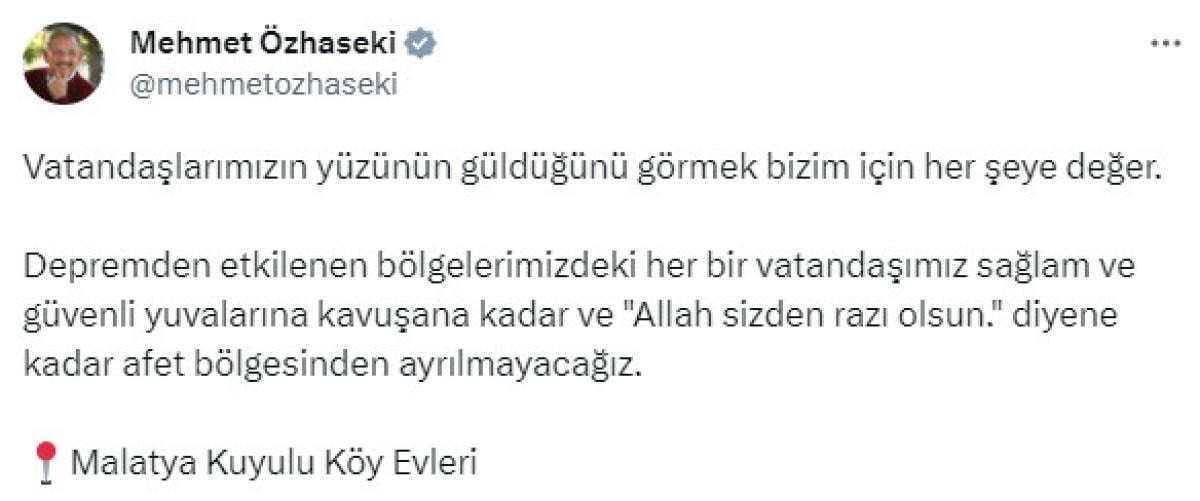 Temel atma töreninin ardından depremzedeleri ziyaret eden Özhaseki, o anları sosyal medya hesabından şu ifadelerle paylaştı: