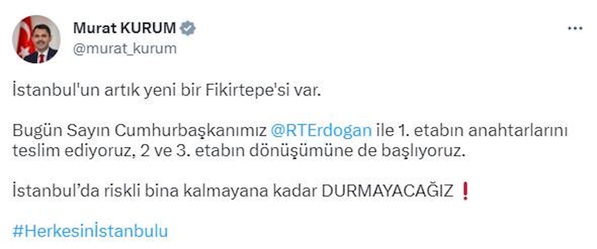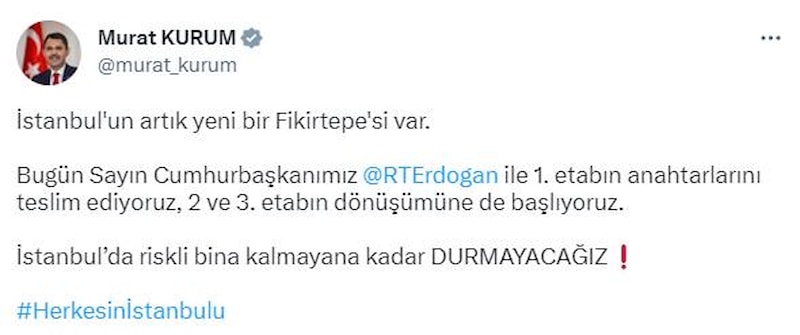 Tören öncesi sosyal medya hesabından paylaşımda bulunan Çevre, Şehircilik ve İklim Değişikliği Bakanı Murat Kurum, şu ifadeleri kullandı: