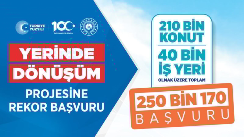 Çevre, Şehircilik ve İklim Değişikliği Bakanı Mehmet Özhaseki, yerinde dönüşüm projesine 210 bin konut, 40 bin iş yeri olmak üzere toplam 250 bin 170 başvuru yapıldığını açıkladı.