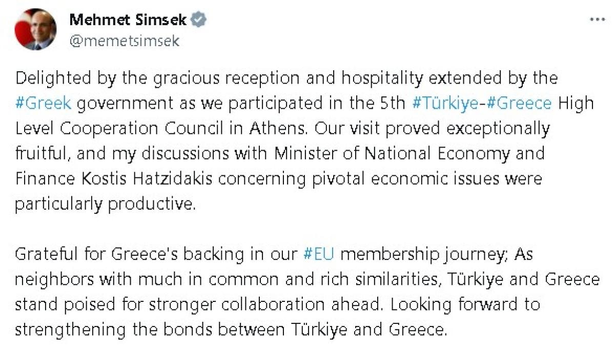 Konseye ilişkin İngilizce paylaşımda bulunan Hazine ve Maliye Bakanı Mehmet Şimşek, Yunan hükümeti tarafından gösterilen nazik karşılama ve konukseverlikten memnuniyet duyduklarını kaydetti.