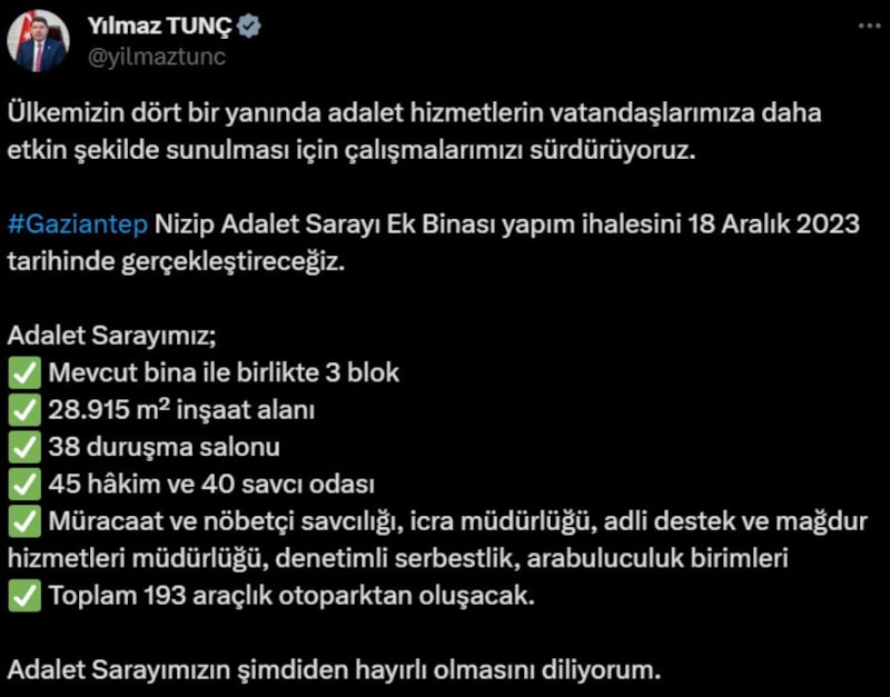 Gaziantep Nizip Adalet Sarayı Ek Binası yapım ihalesini 18 Aralık 2023 tarihinde yapacaklarını açıklayan Bakan Tunç, tüm özellikleri de tek tek saydı.