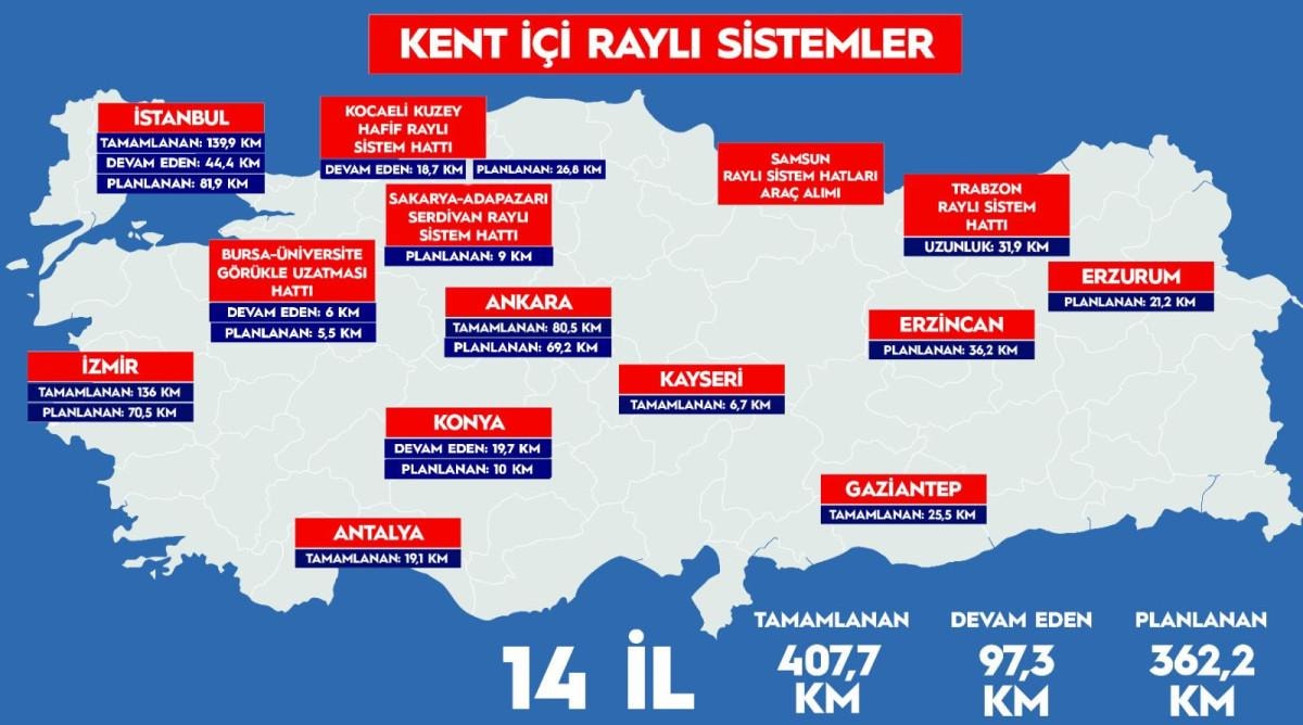 Şu anda da Kocaeli, Konya, Bursa ve İstanbul’da 7 projede toplam 90 kilometre uzunluğunda raylı sistem hattı inşaatına devam ettiklerini de bildiren Uraloğlu, “Türkiye genelinde de 82 kilometresi İstanbul’da olmak üzere 372 kilometre planlama aşamasında projemiz bulunuyor" dedi.