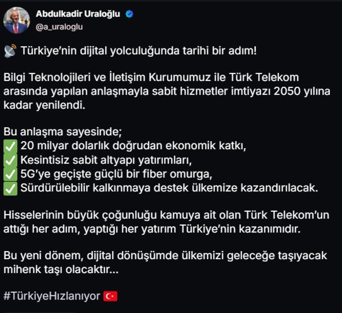 Ulaştırma ve Altyapı Bakanı Abdulkadir Uraloğlu, Bilgi Teknolojileri ve İletişim Kurumu (BTK) ile Türk Telekom arasında varılan anlaşmayla Türk Telekom’un sabit hizmetler imtiyazının 2050 yılına kadar uzatıldığını açıkladı.