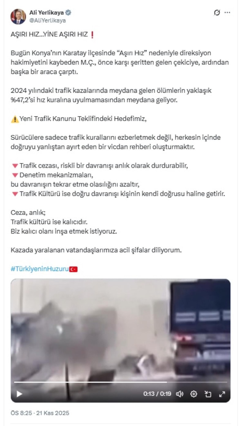 "Bugün Konya’nın Karatay ilçesinde ‘aşırı hız’ nedeniyle direksiyon hakimiyetini kaybeden M.Ç., önce karşı şeritten gelen çekiciye, ardından başka bir araca çarptı. 2024 yılındaki trafik kazalarında meydana gelen ölümlerin yaklaşık yüzde 47,2’si hız kuralına uyulmamasından meydana geliyor. Yeni Trafik Kanunu Teklifindeki hedefimiz, sürücülere sadece trafik kurallarını ezberletmek değil, herkesin içinde doğruyu yanlıştan ayırt eden bir vicdan rehberi oluşturmaktır. Trafik cezası, riskli bir davranışı anlık olarak durdurabilir, denetim mekanizmaları, bu davranışın tekrar etme olasılığını azaltır, trafik kültürü ise doğru davranışı kişinin kendi doğrusu haline getirir. Ceza, anlık; trafik kültürü ise kalıcıdır. Biz kalıcı olanı inşa etmek istiyoruz. Kazada yaralanan vatandaşlarımıza acil şifalar diliyorum"