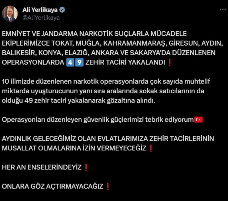 İçişleri Bakanı Ali Yerlikaya, "10 ilimizde düzenlenen narkotik operasyonlarda çok sayıda muhtelif miktarda uyuşturucunun yanı sıra aralarında sokak satıcılarının da olduğu 49 zehir taciri yakalanarak gözaltına alındı" dedi.