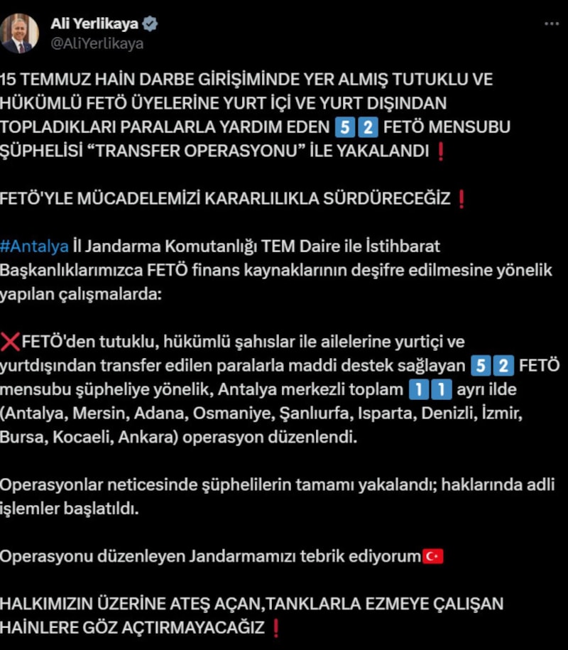 İçişleri Bakanı Ali Yerlikaya sosyal medya hesabından yaptığı açıklamada, "15 Temmuz hain darbe girişiminde yer almış tutuklu ve hükümlü FETÖ üyelerine yurt içi ve yurt dışından topladıkları paralarla yardım eden 52 FETÖ mensubu şüphelisi “Transfer Operasyonu” ile yakalandı" dedi.