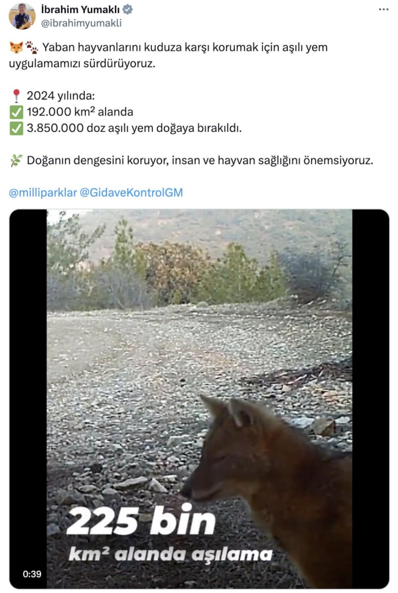 Bakan İbrahim Yumaklı, sosyal medya hesabından yaptığı açıklamada, "Yaban hayvanlarını kuduza karşı korumak için aşılı yem uygulamamızı sürdürüyoruz. 2024 yılında 192 bin kilometrekare alanda 3 milyon 850 bin doz aşılı yem doğaya bırakıldı. Doğanın dengesini koruyor, insan ve hayvan sağlığını önemsiyoruz." dedi.