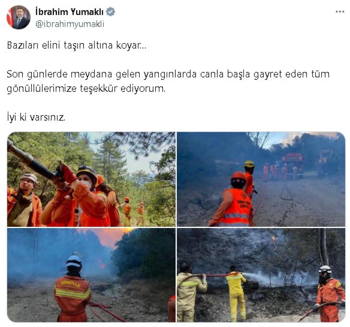 Son günlerde meydana gelen yangınlarda canla başla gayret eden tüm gönüllülerimize teşekkür ediyorum.
