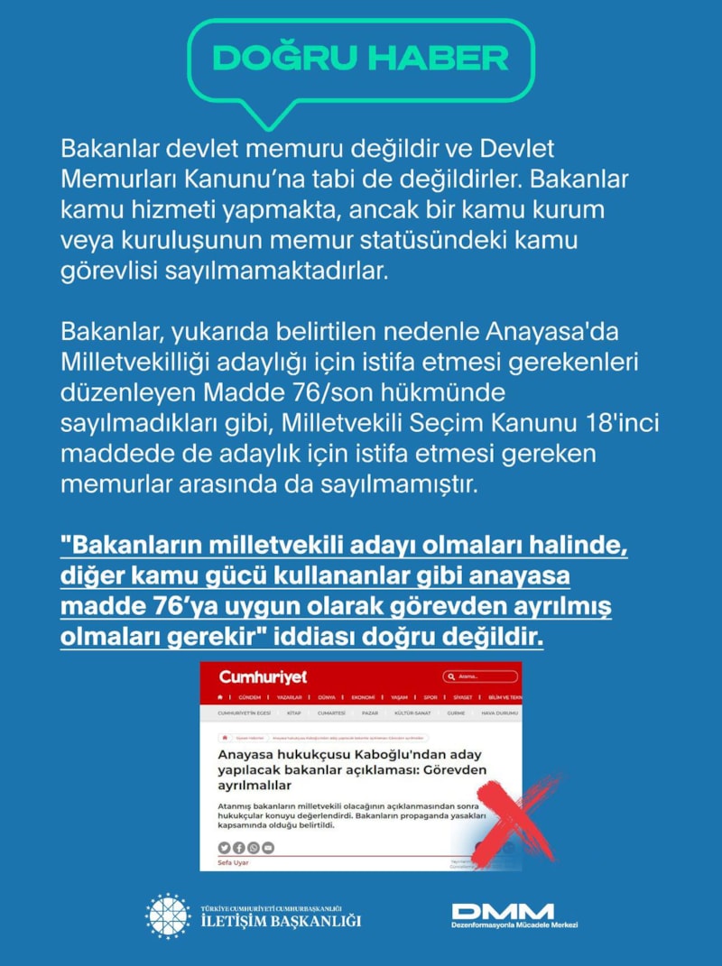 Muhalefet tarafından köpürtülen bir iddianın daha gerçeği yansıtmadığı ortaya çıktı. Bakanların milletvekili olabilmeleri için görevlerinden istifa etmesine gerek yok.